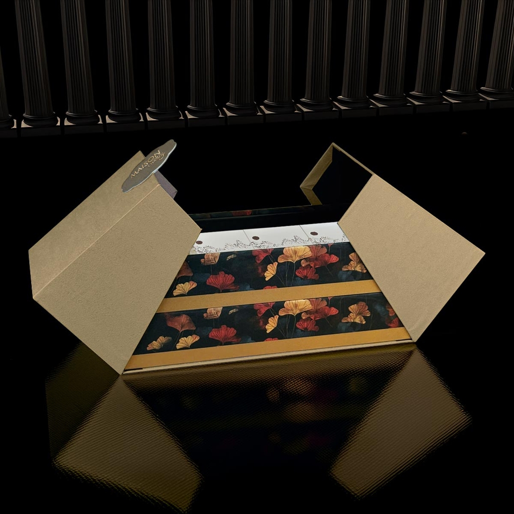 Bên trong, hộp được trang trí bằng họa tiết lá Ginkgo (Ngân Hạnh) – biểu tượng của sự trường tồn và trí tuệ – được in UV sắc nét, tạo chiều sâu và điểm nhấn thẩm mỹ độc đáo.