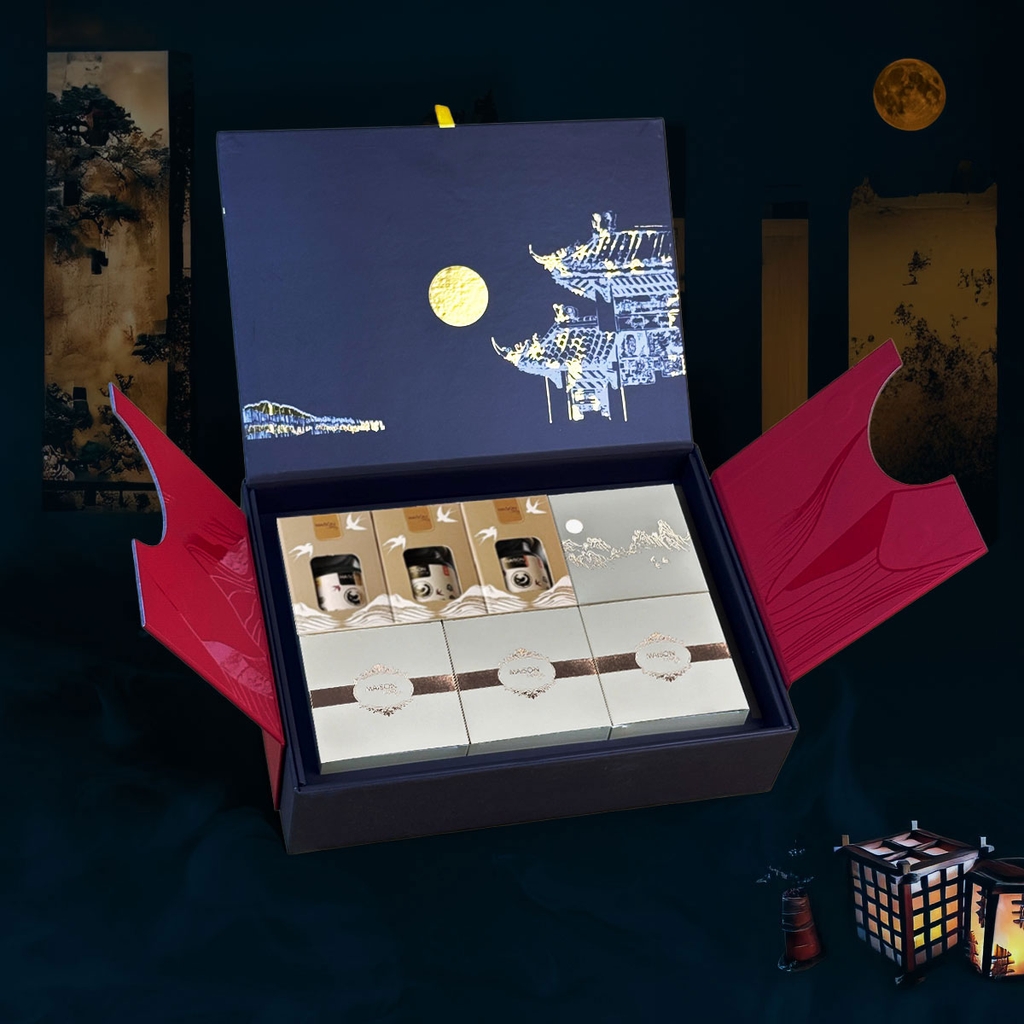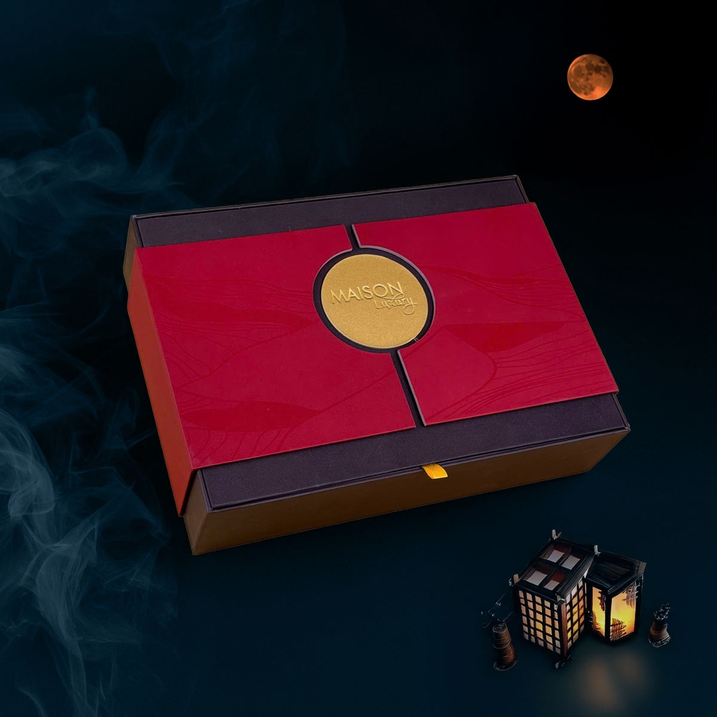 Lấy cảm hứng từ ý nghĩa “Trường An” – sự bình yên lâu dài và viên mãn, hộp bánh trung thu Maison Trường An gây ấn tượng với cấu trúc hộp cánh mở sáng tạo, tạo nên trải nghiệm mở hộp đầy bất ngờ và trang trọng. Lớp vỏ hộp màu đỏ trầm kết hợp nâu trầm lịch lãm, được in offset và phủ màng nhung cao cấp, tạo cảm giác mượt mà, sang trọng khi chạm tay.